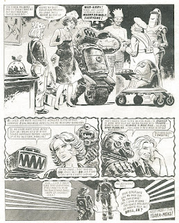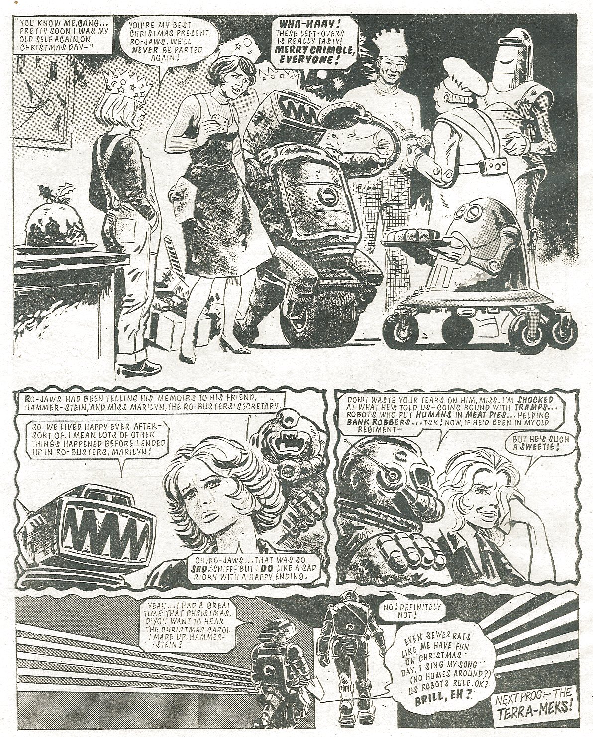 Pat is joined here on art duties by the great Mike Dorey ( no relation ) and in keeping with the season, Mike dips his ink pen in soot from his victorian chimney, and the whole thing gives you a nice warm Christmassy glow. Until, presumably, Ro-Jaws eats everything in the house.