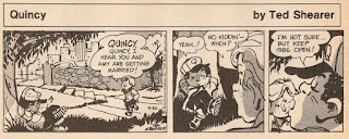 This Quincy is the story of a tenement kid and his philosophical musings, ran from 1970 to 1986, and was by Ted Shearer, making it one of the first newspaper strips about a black protagonist by a black creator. It's gentle and upbeat, and has a masterful sense of evocation, which is really why I like it, as you are absolutely there in '70's Harlem with Quincy and his pals.