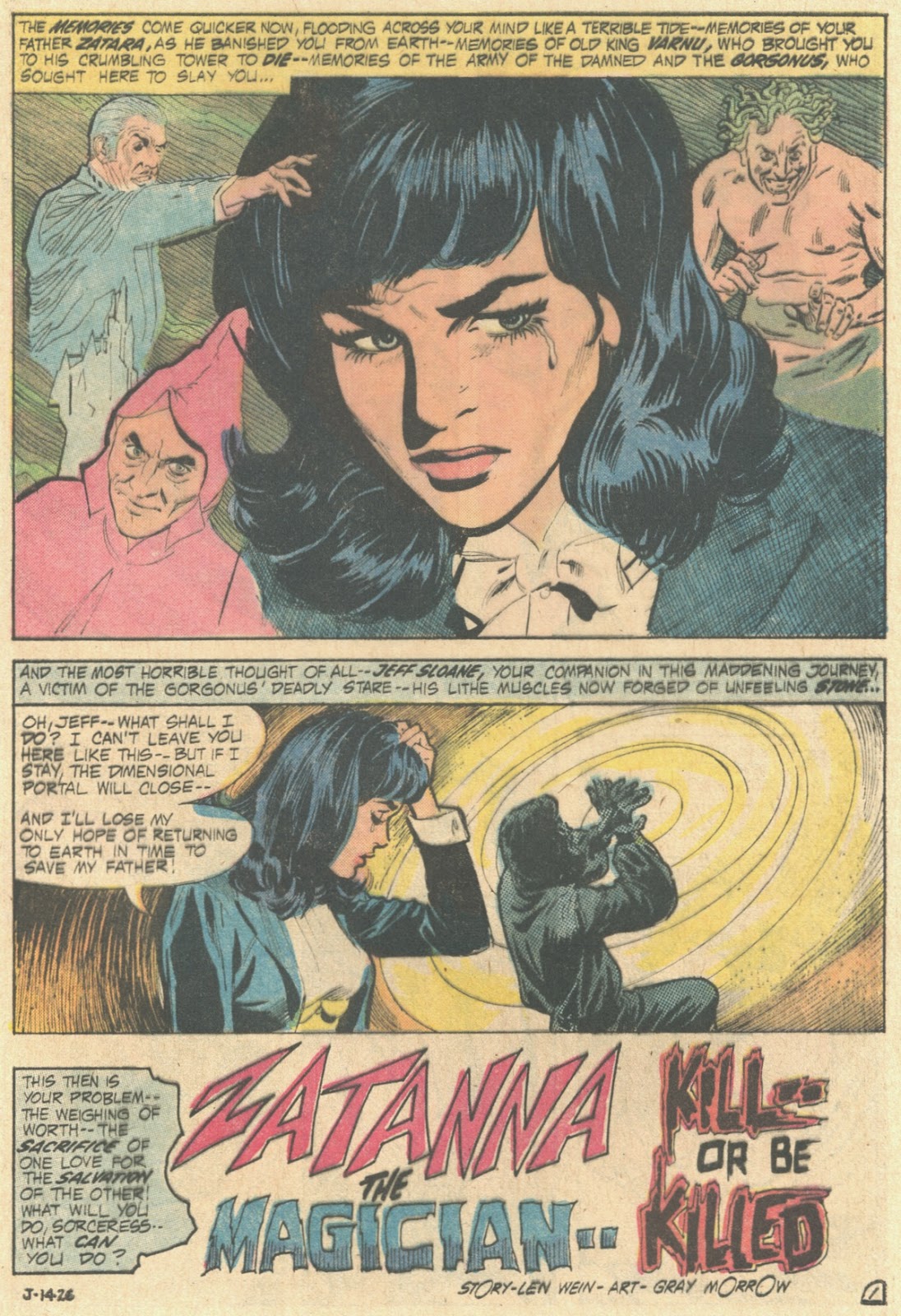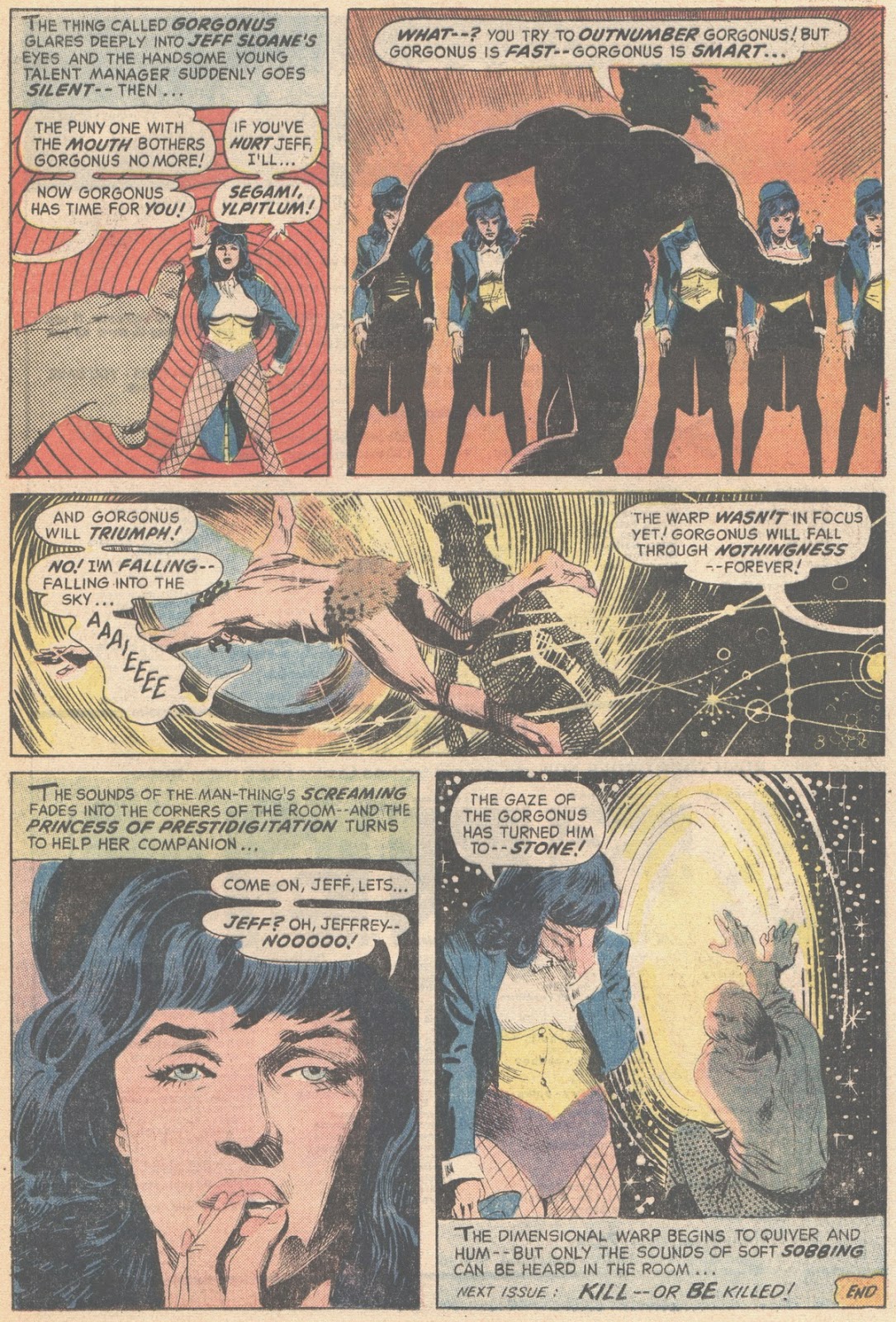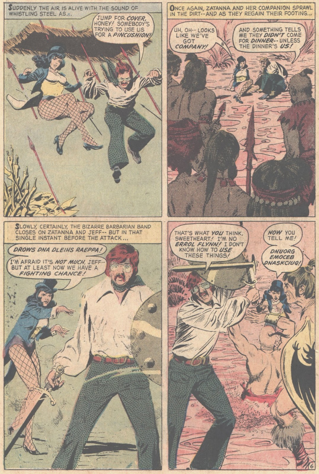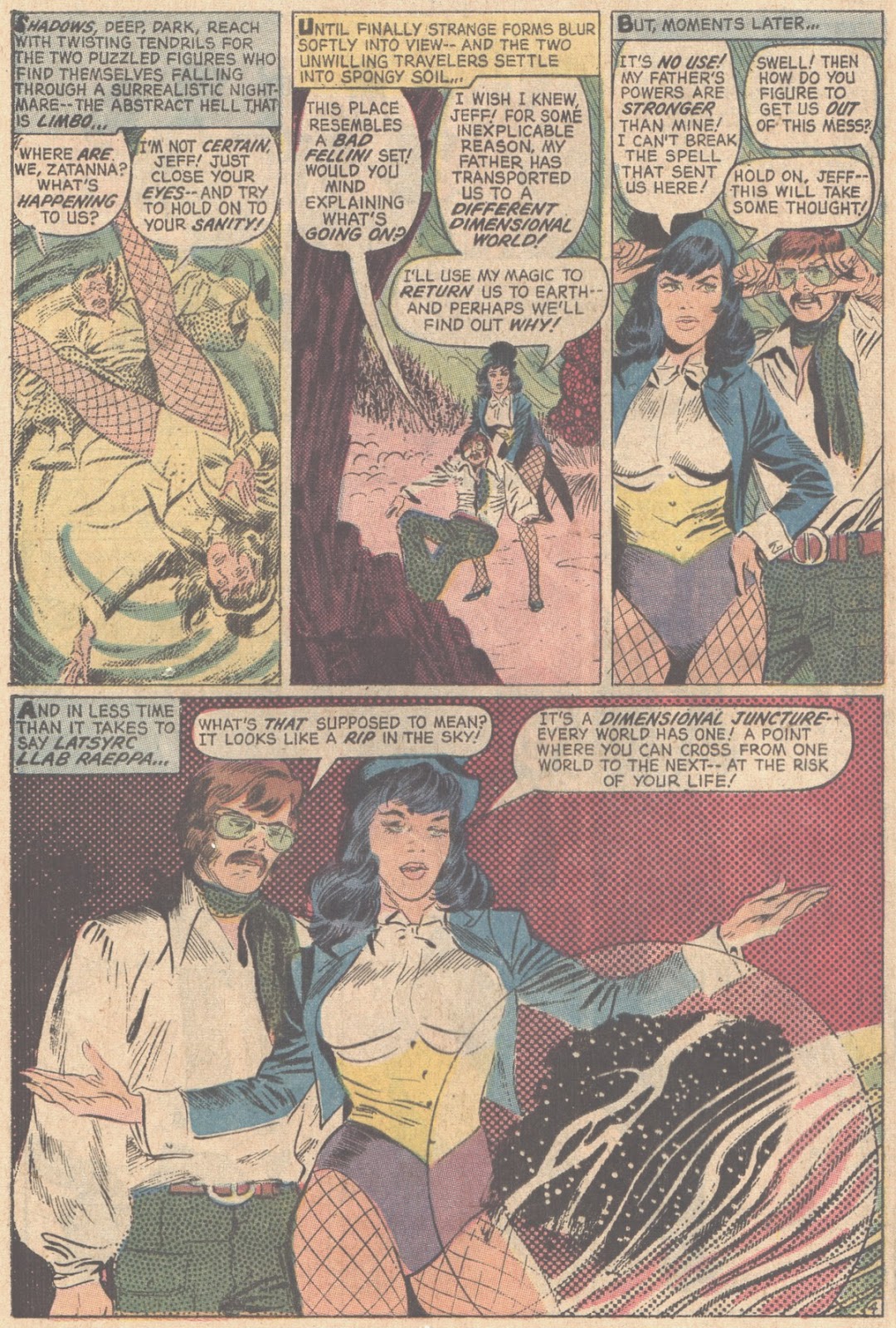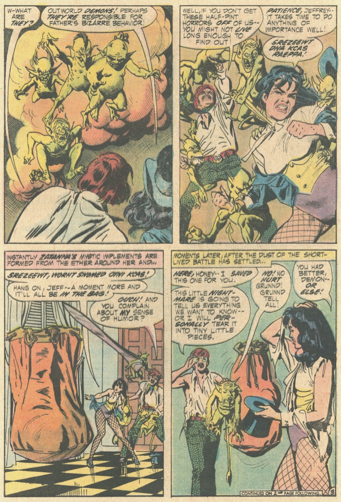 I always found Zatanna's habit of speaking spells backwards something that slowed down the story, and though she was never quite as compelling a character as her Devil's Daughter namesake over at Marvel, being Millie The Model to Satana's Chili, she comes across well here, particularly the way Gray draws her, and that panel where she complains of her tongue wilting is absolutely priceless.